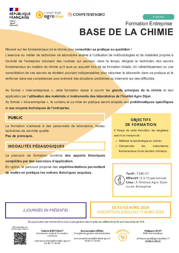 Au format « inter-entreprises », cette formation visera à couvrir les grands principes de la chimie et leur application par l’utilisation des matériels et instruments des laboratoires de l’Institut Agro Dijon.