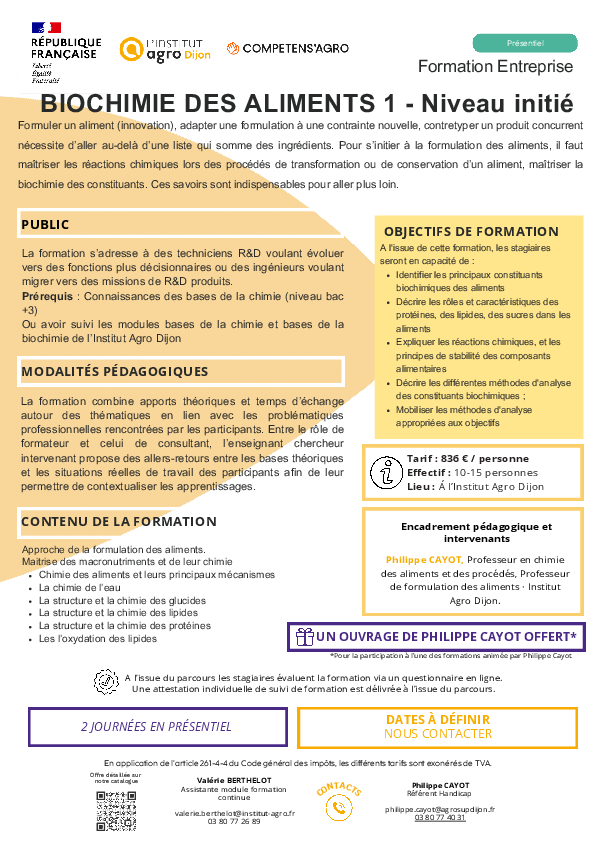 Connaissances des bases de la chimie (niveau bac+3) ou avoir suivi les modules bases de la chimie et bases de la biochimie de l'Institut Agro Dijon