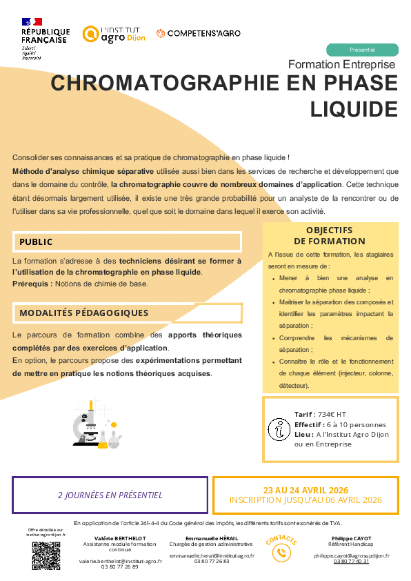 Destinée à des techniciens de laboratoire maitrisant les bases de la chimie, cette formation s’attache plus particulièrement à l’utilisation de la chromatographie en phase liquide.