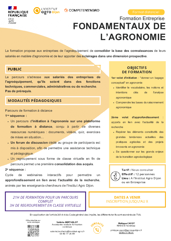 Les thèmes proposés peuvent faire l'objet d'une discussion afin de répondre pleinement aux attentes du public visé. Les webinaires d'une durée de deux heures sont animés par des enseignants-chercheurs de l'Institut Agro Dijon : ils sont constitués d'une présentation théorique d'une heure puis d'un temps d'échanges d'une heure.