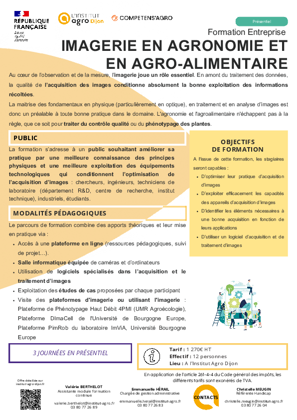 Cette formation complète allant de l'acquisition (essentielle) aux traitements bénéficiera des matériels de la plateforme d'imagerie (possiblement Atelier du Faire à L'Institut Agro Dijon) listés ci-dessous :