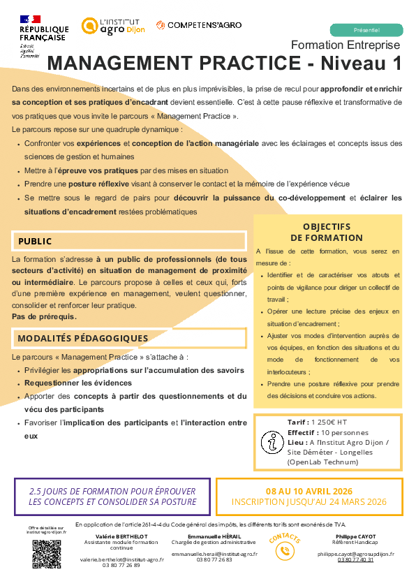 - public de professionnels (de tous secteurs d’activité) en situation de management de proximité ou intermédiaire. Le parcours propose à celles et ceux qui, forts d’une première expérience en management, veulent questionner, consolider et renforcer leur pratique.