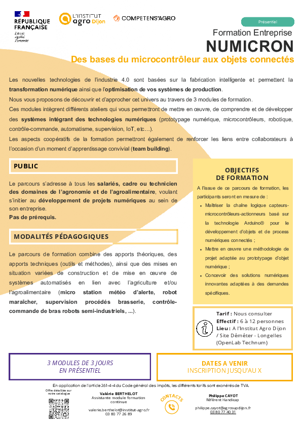 La formation sera l’occasion d’une immersion au sein de l’Open Lab de l'Institut Agro Dijon, sous forme d’ateliers de fabrication. Elle permettra l’accès à l’intégralité des ressources : microcontrôleurs Arduino, Raspberry Pi, ordinateurs portables, bibliothèques d’effecteurs et de capteurs, imprimantes 3D, CNC…
